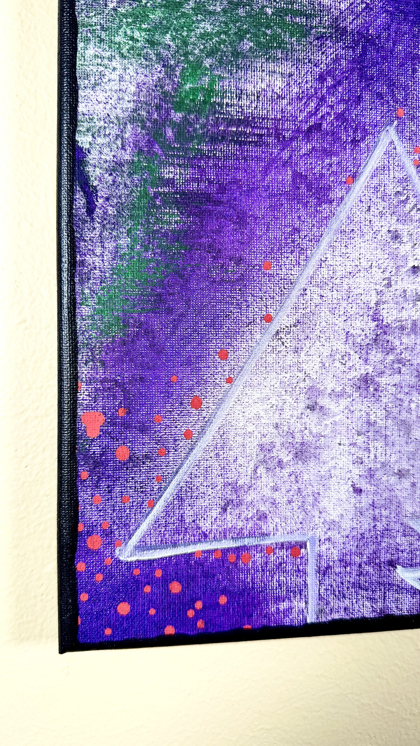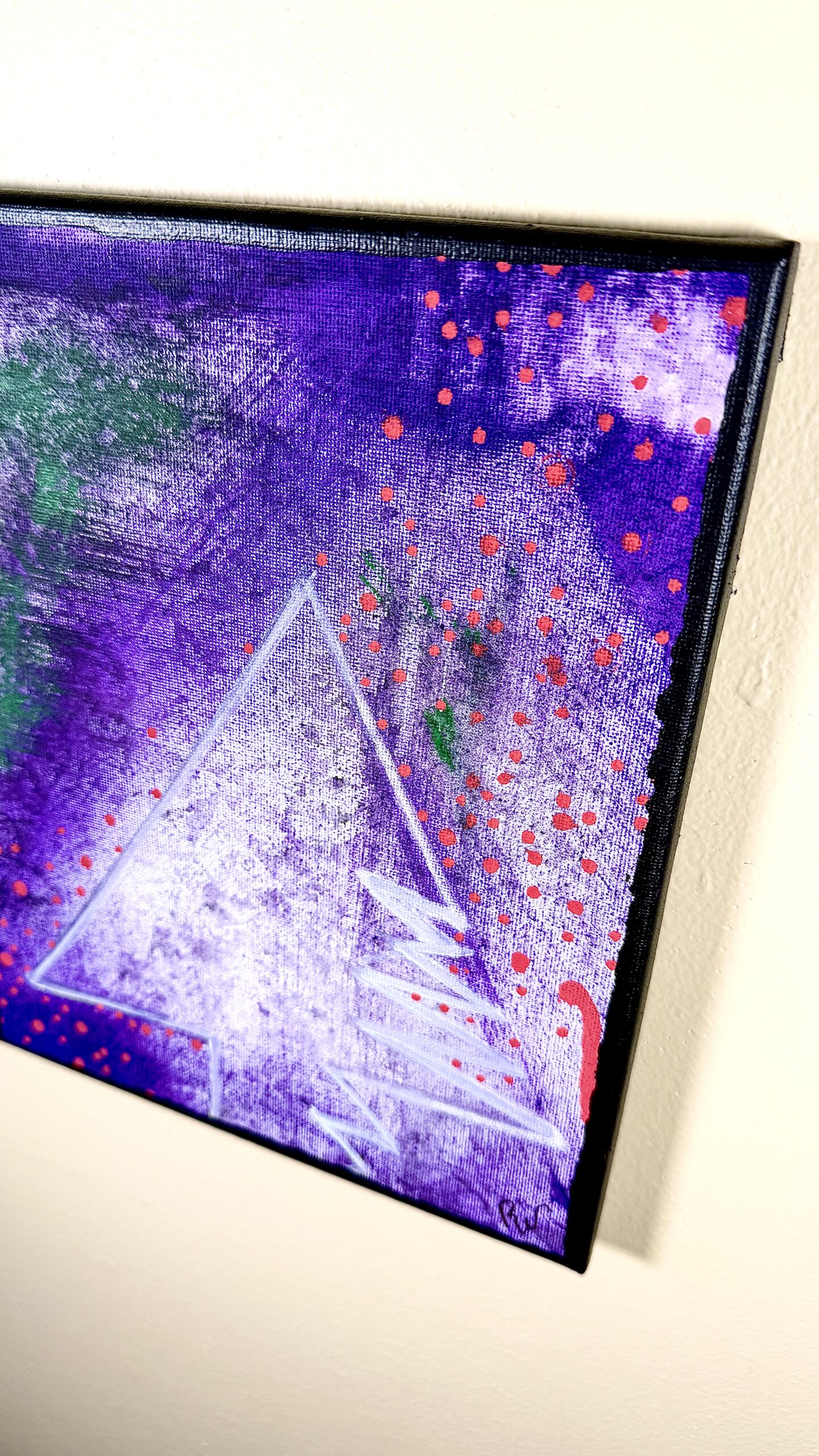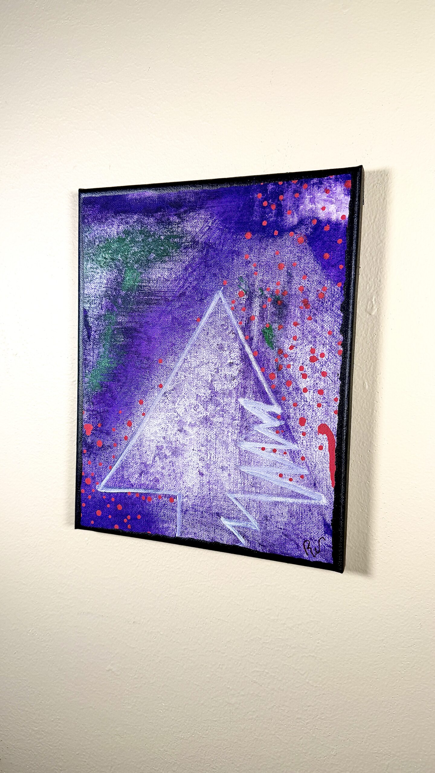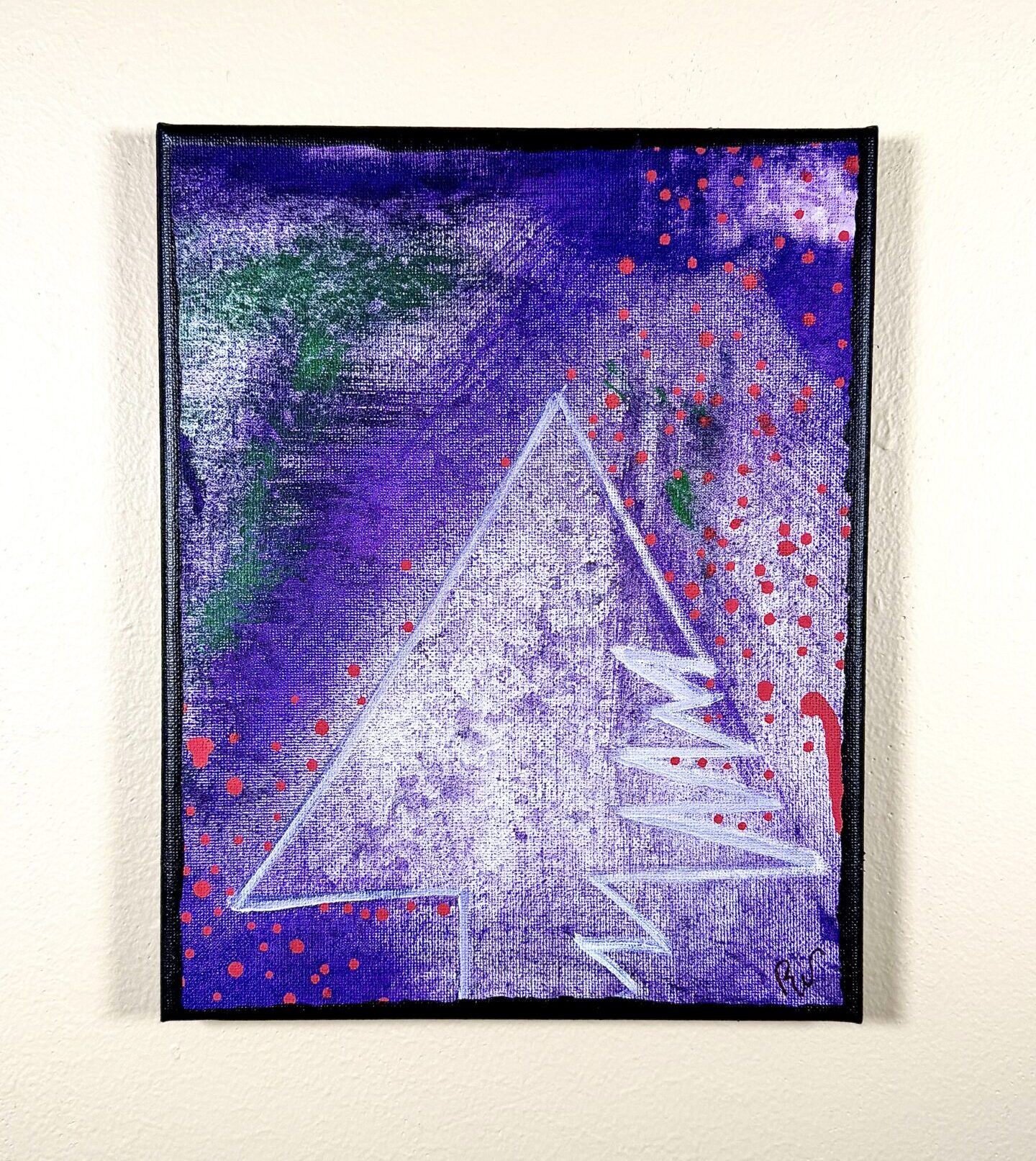 A LONE EVERGREEN HOLDS ITS SHAPE INSIDE A VIOLET NIGHT, DUSTED WITH EMBER-LIKE SNOW.